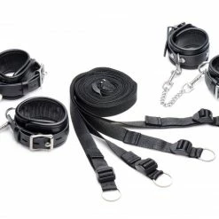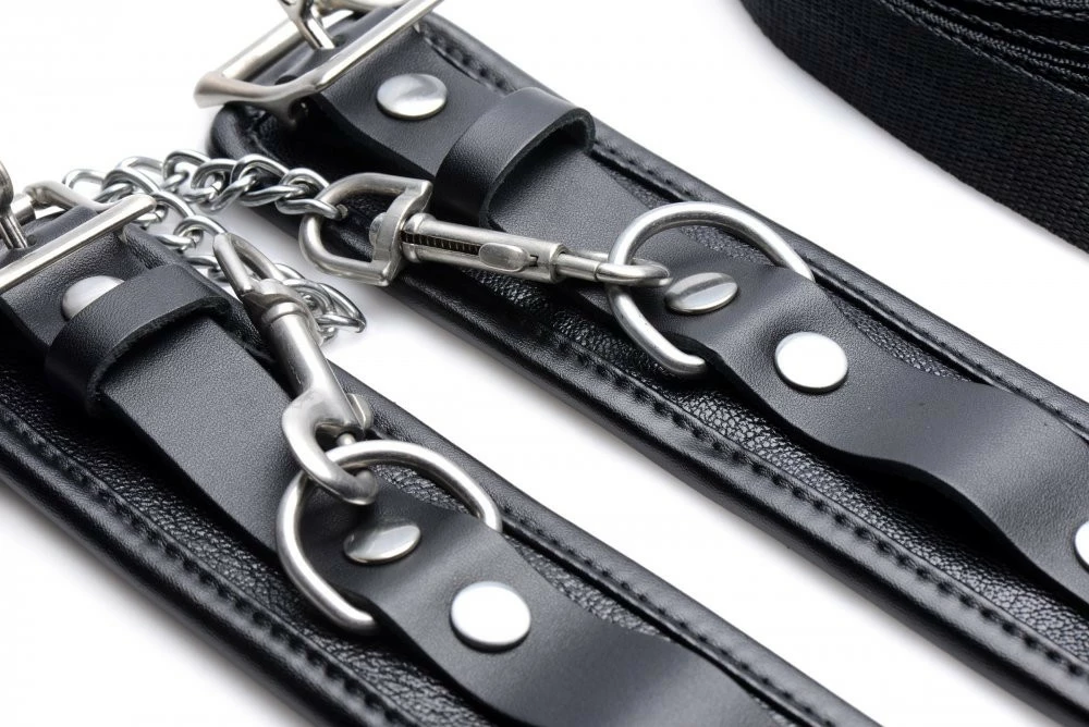 Transfigure your bed into a devious piece of bondage furniture with this easy-to-use bed restraint set! Strap your plaything into the adjustable and comfortably padded restraints at both sides of the bed. These cuffs are made of premium leather for a luxurious look and feel. Their wrists and ankles will be spread open, leaving your lover exposed and vulnerable to all the naughty things you have in store for them! Watch them writhe in pleasure and pain as you spank, tickle, and fuck them. They will love feeling helpless to your every desire! Locking buckles allow you to ensure that they have to way of escape until you’ve had your way. Just slide the nylon straps under your bed and adjust them to fit any sized bed. Adjust the cuff straps as needed and create the kinky atmosphere you’ve been waiting for!