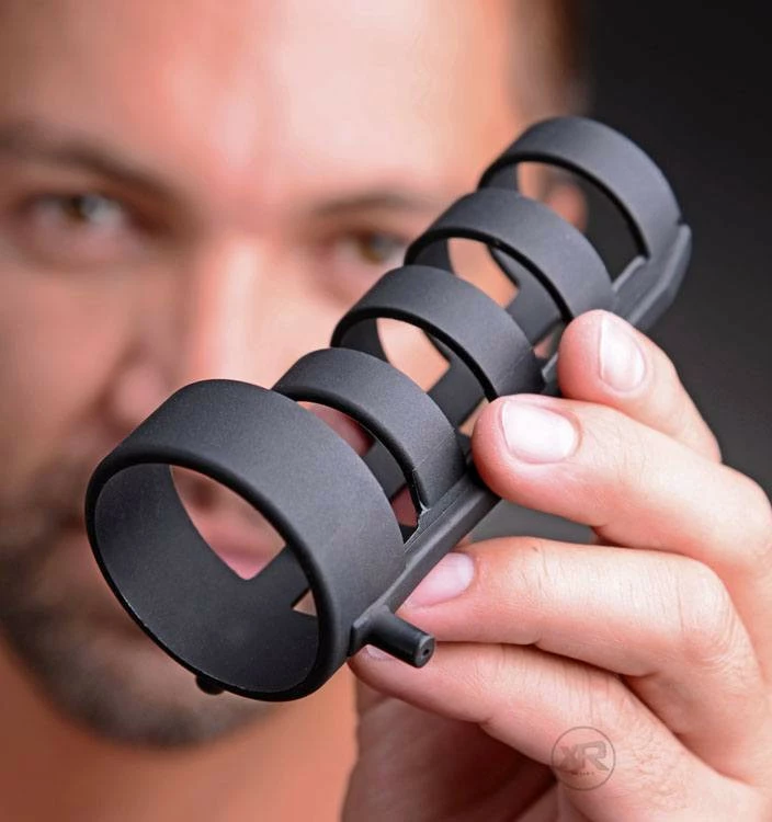 For fans of electro stimulation, this sheath is the perfect way to deliver it while you fuck your partner! Compatible with any Zeus powerbox system, this cock sheath allows you to control the e-stim that flows through the outside of the dual bands that run the length of your cock. You won’t even feel it as you slide your electro-cock into your partner, but they sure will! The sensations produced inside their body will be a prickling or tingling pulsation that will make their muscles clench repeatedly around your cock! Slide your balls through the big strap at the end to secure it on your body and give yourself the added sensation of a cock-ring to enhance your erection.