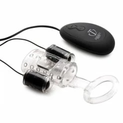 Add more to your teasing, edging and milking! With this Dual Vibrating Cock Teaser with Cock and Ball Ring, you can turn the intensity up and down and feel the pressure build in your cock as you enjoy more powerful orgasms and longer, harder erections!! Each powerful, buzzing motor sits inside a bullet on either side of your shaft. Using the battery-operated remote connected to the two bullet vibes, you can switch between 3 speeds and 7 patterns until you find the one that will bring you over the edge… or the one that will edge you until you can’t take it anymore! To keep the vibes in place, the stretchy, TPR sleeve wraps around your cock and holds them exactly where you place them. Enjoy the textured nubs on the inside of the sleeve! To help keep it even more securely in place and to help keep an erection, the clear cock ring slides down around your cock and balls. Use some water-based lube to slip it on and reduce friction, then go to town!