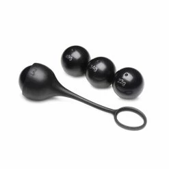 Work out your cock as you rock a hard rod! These steel ball weights are designed not only to enjoy the satisfaction of your cock being weighed down and stretched as you relax, they are also working out your PC (pubococcygeal) muscles when you lift! Who doesn’t want to work out their whole body – including their dick muscles! With these three steel balls you can try out three different weight categories. Simply place one ball at a time in the silicone carrier, then slip the ring over your cock so it wraps comfortably right above the head (glans) of your penis. The premium silicone is soft and stretchy for your comfort and is completely body safe and easy to clean. Have fun while you use these dark danglers to flex your muscles! After use, simply wash with warm water and mild soap, then spray with a toy cleaner.
