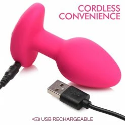 Every hungry hole needs a special toy to fill it and this travel friendly, brightly colored, soft and silky butt plug is the perfect addition to your toy kit! With 3 speeds and 7 patterns of rumbling, buzzing, blissful vibration, you can enhance every other touch and sensual act as you control the patterns with a remote that has a distance of up to 26 feet away! Tempt your partner to play a game and turn you on in public! Have them tie you up and bind you while they control your plug! The tapered tip makes insertion easy and the slim neck makes it so long sessions are comfortable and the base slips between your cheeks during activity or play. Indulge without worry; this hypoallergenic, unscented, silky smooth silicone is body safe for happy bottoms! Recharge between uses with the USB cable provided. Wash after use with warm water and mild soap, then spray with a toy cleaner and store separately from other silicone toys.