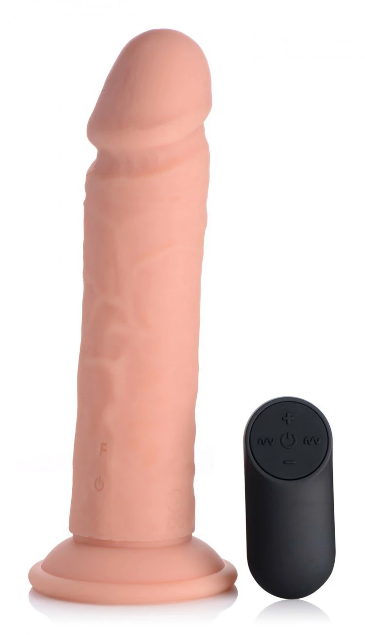 Made of silicone silk, this remote control vibrating dong is the whole package! The phallic head and sculpted veins look and feel like the real thing, while you are vibed by 7 patterns that buzz at 3 strength levels, for a total of 21 functions of vibration! Use it with or without the remote control, which provides more convenience during solo play, and an exciting power dynamic during partner play. The strong suction cup base allows you to mount it to a smooth, hard surface and take it for a ride, but it is also harness compatible for strap-on play. The waterproof pleasure tool can even be taken in the bath or shower for steamy, wet fun! This premium material is non-porous and phthalate-free for a body-safe experience, but not compatible with silicone lubricants.