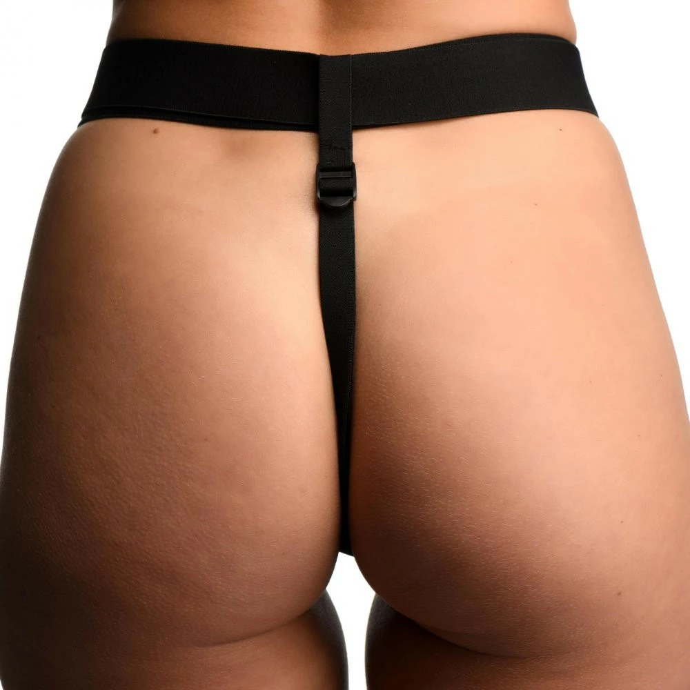 Measurements: Waistband adjusts from 26 inches to 48 inches in circumference, unstretched. Crotch strap adjusts up to 25 inches in length. Plug is 3.9 inches insertable, 1.3 inches at widest diameter.