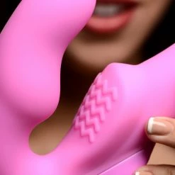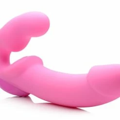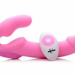 The first of its kind, this strapless strap-on doesn’t just provide vibrating penetration to both partners, it also operates via remote control! The small side allows the top partner to insert the bulb vaginally, either holding it in place with their PC muscles or utilizing a harness for additional support. The curve of the bulb provides subtle G-spot pressure, while a textured grinding pad for the clit provides exterior pleasure with every thrust! The long, silky-smooth shaft gives you plenty to please your partner with, including a bold coronal ridge that provides G-spot or prostate stimulation. Both of you can benefit from the 3 incredible levels of thrumming, and 5 brilliant patterns of throbbing! The dual independent motors can be controlled via the power pad on front of this double dildo, or via the easy-to-use remote control! Great for pegging or sex without penises! This couples toy is made of high-grade silicone, making it non-porous and phthalate-free. Avoid use with silicone lubricants to preserve the material.