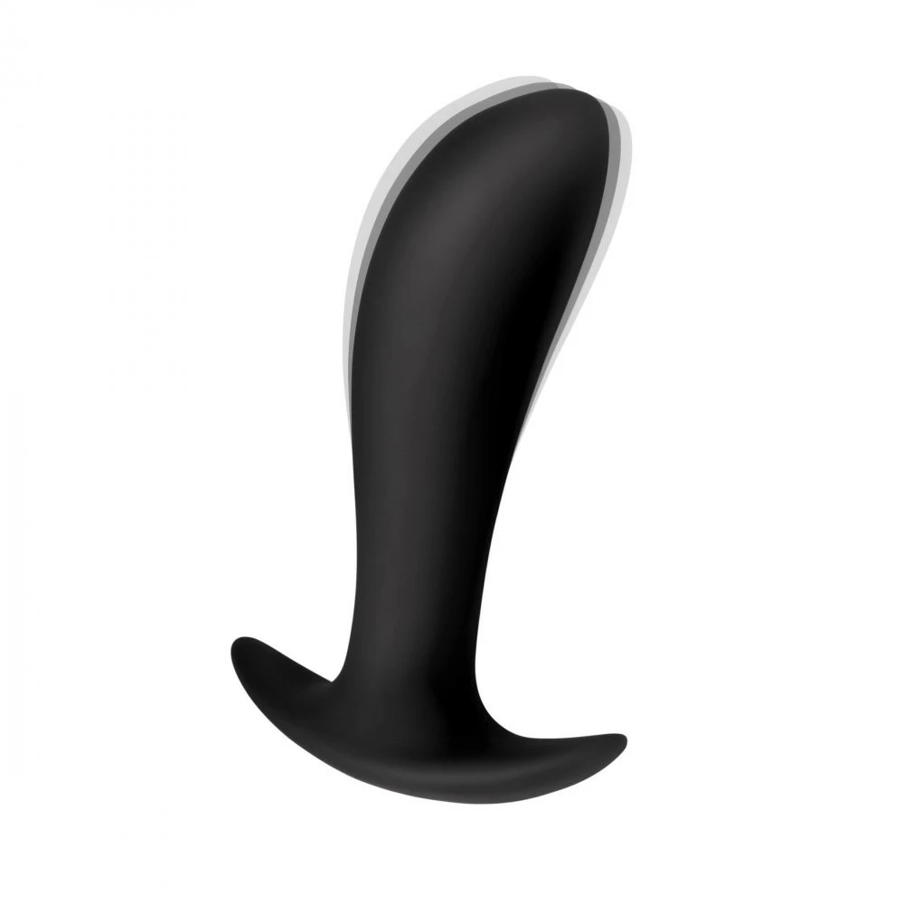 Made of silky silicone, this beautiful butt plug is curved for prostate stimulation, but would be delightful on a female body as well. A handy remote control makes this pleasure tool more accommodating for masturbation, and adds an exchange of power to your play with a partner. With the controller within your grasp, you can treat that ass to 4 intensities of vibration, and 7 pulsation settings. Wear it around the house to turn chores into foreplay, or transform an ordinary night on the town into a sexual adventure! The plug is even waterproof so that you can take it in the shower. The narrow base fits comfortably between buttcheeks for hours of excitement. The high-grade material is phthalate-free and non-porous. Sanitize with warm water and mild soap or toy cleaner.