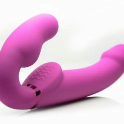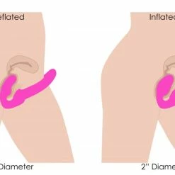 Together you can experience vibrating penetration with this remote control, state-of-the-art, silicone strapless strap-on! The small side allows the top partner to insert the bulb vaginally, either holding it in place with their PC muscles or utilizing a harness for additional support. One of the most exciting features of this device, however, is that the vaginal bulb can actually be inflated with the push of a button, locking it in place and putting pressure on all the right parts! A textured grinding pad for the clit provides exterior pleasure with every thrust! The long, silky-smooth shaft gives you plenty to please your partner with, including a curved tip and bold coronal ridge that provides G-spot or prostate stimulation. Both of you can benefit from the 3 powerful levels of thrumming, and 7 thrilling patterns of throbbing! The dual motors and inflation and deflation mechanism can be controlled via the power pad on front of this double dildo, or via the easy-to-use remote control! Great for pegging or female-female sex! This couples toy is made of high-grade silicone, making it non-porous and phthalate-free. Avoid use with silicone lubricants to preserve the material.