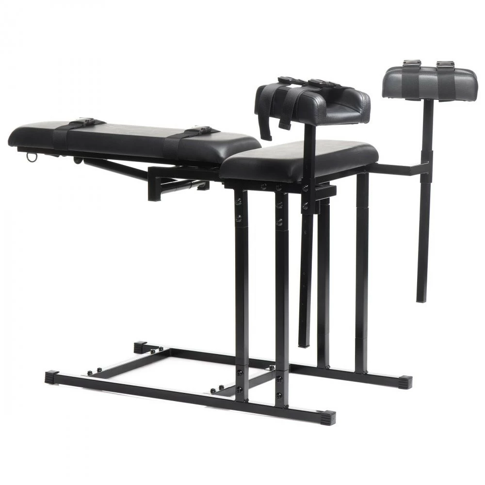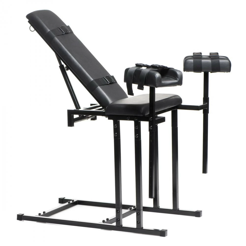 Durable, strong, comfortable and sexy; this versatile, fully adjustable bondage chair is perfect for adding to your sex room, play space, bedroom or dungeon! With multiple ways to be used, you can allow your imagination to go wild and try out every pose possible with your partner! Compatible with the Dicktator Extreme Sex Machine, you can also strap yourself in to a reclined position and recieve the pounding from the dildo of your choice! With plush, comfortable cushions, this chair is perfect for long, drawn out scenes! The heavy duty frame can support up to 440 pounds of weight so you can relax and play hard without worrying while you thrust and bang or while your submissive is writhing in agony or pleasure! The chair has straps with quick release buckles so you can easily take a break when a pause is needed. The PU leather is a perfect faux leather option that is easy to clean and care for. The frame is made of iron and wood for sturdy and reliable use. There are D-rings along the chair so you can attach any implements or tools of your choice for easy access or use. Enjoy sitting upright or reclining to get that perfect angle! To clean the chair after use, spray with a toy cleaner and use a soft cloth to wipe it clean. Avoid exposure to sunlight and heat to preserve the PVC faux leather material longer.