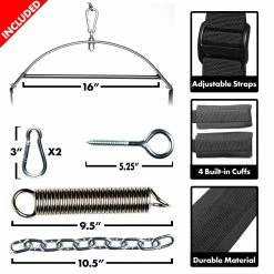 This fully adjustable sex harness makes having sex in many unusual positions possible. Completely pre-assembled. One connection point for hanging. Supports back and butt (or waist and knees) with adjustable straps. Soft padded stirrups for feet, ankles, calves or thighs. Extra-wide nylon straps with self-tightening buckles. Torque support bar at top for added leverage. High-strength spring facilitates bouncing. Rotates easily. Can be easily detached (for storage) from its hanger eyelet with its spring-open hook. Please consider the weight-bearing capability of your installation spot.