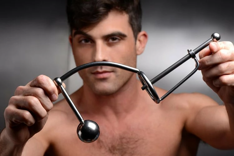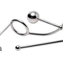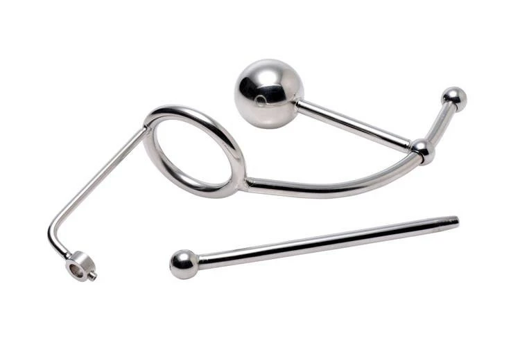 Make your pet pleasure you while he’s stuffed with this all-in-one male confinement instrument! All his holes belong to you, so if you want to fill them up with cold, unforgiving stainless steel, now you have a device that can make that happen. Tease and torment your plaything with a sliding anal plug in the form of a 1.75 inch metal ball. The sliding mechanism allows this instrument to customize comfortably to most body types. The cock ring is perfect for fitting his pathetic cock and balls through, to leave them sensitive and vulnerable to your devious desires, particularly if those desires include sounding! A hollow 5.5 inch sound can be slipped into his useless shaft and secured in place with the included allen wrench. Keep him trapped full of stainless steel for as long as you want! He will be able to pee through the sound, and even cum through it if he can manage and if you let him!