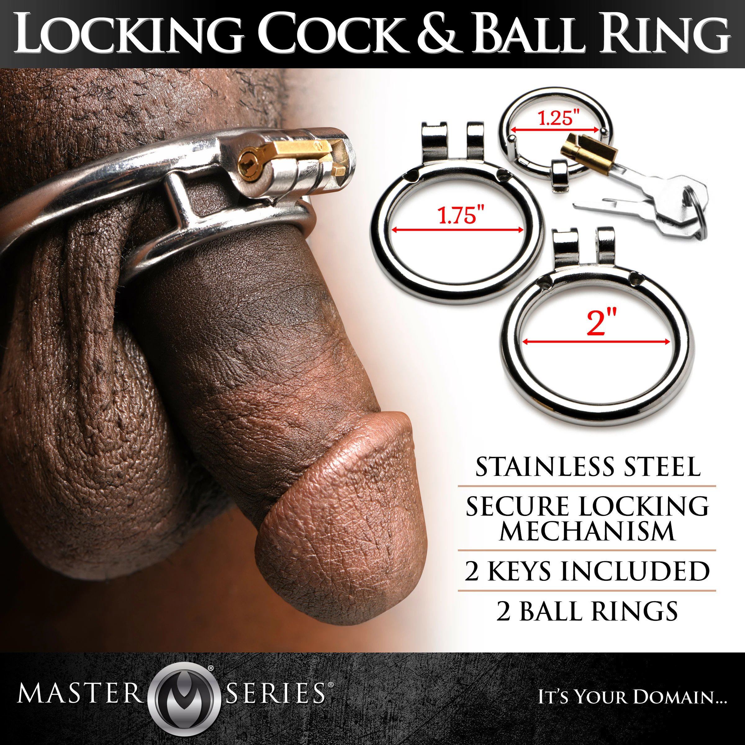 Measurements: Cock ring inner diameter: 1.25 inches. Ball ring inner diameters: 1.75 inches, 2 inches.