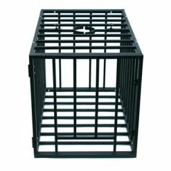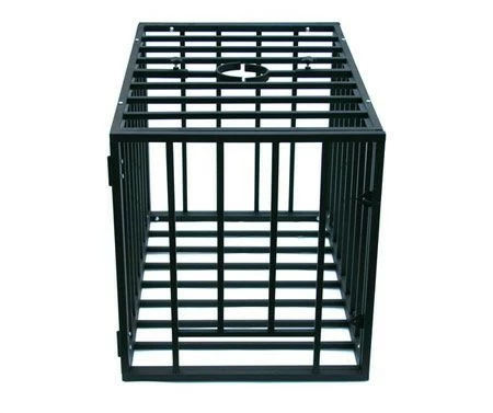 Assembly is easy and takes about 15 minutes using the provided wrench. The cage is made up of 6 parts. Top, Bottom, Front, Back, Right and Left. With about a dozen bolts that screw the sides together the cage is complete. Locks securely with two padlocks, not provided. Dimensions are: 48 inches long by 32 inches in height and 30 inches wide. Each cage is made by hand by our talented blacksmith.